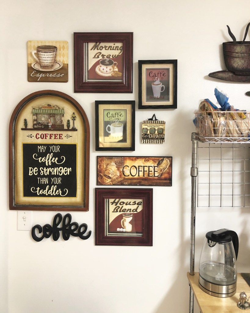 One of the more fun projects I helped her with was with home decor. They have a little breakfast nook/laundry room set off from the kitchen. Since they have now become a dog family, that area is now a laundry room/dog bedroom — more of a utility space than living space. These bits of coffee themed art were spread around that room and didn’t fit the space any more. Some of these were given to her from her sweet mother, for her Hope Chest, when she was as young as 15 years old. We pulled them all down and I arranged them for her in a collage to fit in the only available wall space in her kitchen: beside her coffee. She absolutely LOVES the way it turned out. She said that hanging pictures on the wall has always been a struggle for her because she can not envision the end result. I understand that completely, it is a skill I have worked to develop for years. I have been working and reworking the collage going up my stairway for years and have just recently gotten it close to what I had first dreamed up in my mind’s eye. I am no expert, and I still have to take a deep breath before hammering a nail into a freshly painted wall, but I am glad my years of trial and error have helped develop my eye and I was able to help her so quickly!